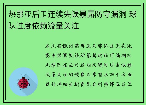 本文将探讨热那亚足球队后卫在比赛中频繁失误所暴露的防守漏洞,以及球队在应对这些问题时过度依赖流量关注的现象。文章将从四个方面进行详细分析:首先,分析热那亚后卫连续失误的表现及其对防守体系的影响;其次,...