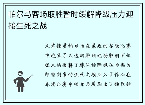 帕尔马客场取胜暂时缓解降级压力迎接生死之战
