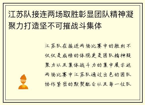 江苏队接连两场取胜彰显团队精神凝聚力打造坚不可摧战斗集体