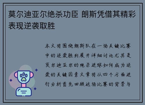 本文将围绕朗斯队在一场关键比赛中的逆袭胜利展开详细讨论,尤其是莫尔迪亚尔的绝杀进球如何成为逆袭的关键因素。文章将从四个方面进行分析:首先,回顾这场比赛的背景与战局变化,其次分析朗斯队的战术调整与球员表现,接着聚焦莫尔迪亚尔的精彩个人表现及其...