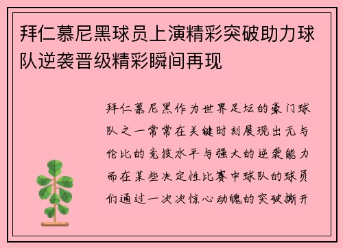 拜仁慕尼黑球员上演精彩突破助力球队逆袭晋级精彩瞬间再现