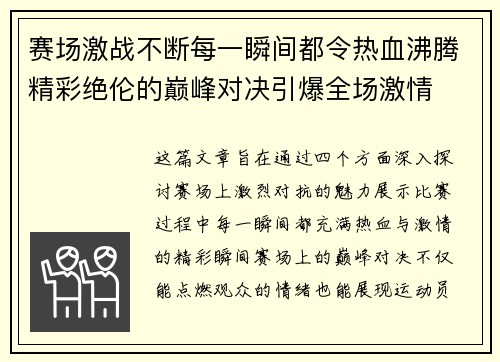 赛场激战不断每一瞬间都令热血沸腾精彩绝伦的巅峰对决引爆全场激情